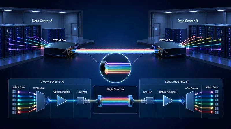 A DWDM DCI Box (Dense Wavelength Division Multiplexing Data Center Interconnect) allows multiple wavelengths to be transmitted simultaneously over a single fiber. This capability significantly increases bandwidth without additional physical infrastructure. Its key features include flexible deployment, high scalability, and low-latency transmission. Supporting dozens of wavelengths, modern devices can achieve data rates up to 400G or even 800G. Furthermore, they maintain reliable transmission across tens to hundreds of kilometers while minimizing signal degradation.