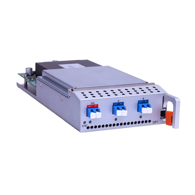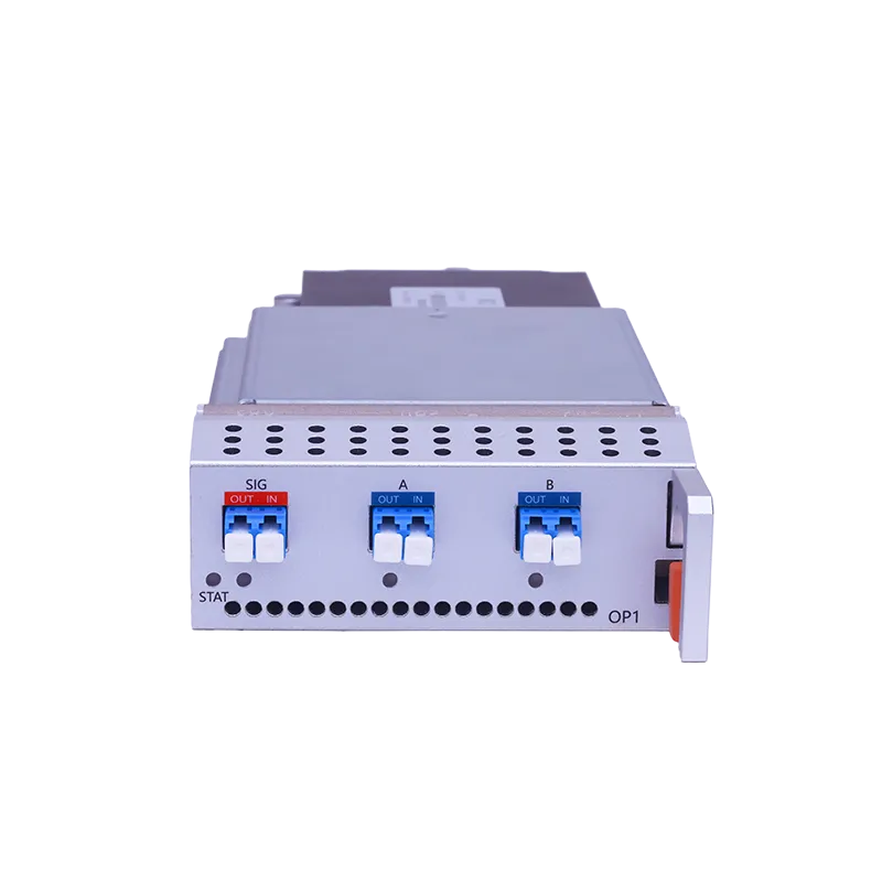 The HT6800-OP1 is a single-channel OLP (Optical Line Protection) card for the HT6800 DCI DWDM Optical Transmission System. Using dynamic synchronous optical switching technology, it provides 1+1 protection with sub-20ms switchover when fiber breaks or signal degradation occurs. Features SIG, A, and B ports. Occupies 1 slot in the HT6800 chassis.