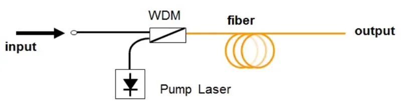 Raman Amplifiers rely on stimulated Raman scattering (SRS). In practice, you launch a strong pump and a weaker signal into the same fiber. Then, the pump interacts with the fiber and transfers energy to the signal at a longer wavelength.