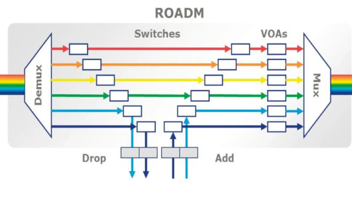 - Variable optic attenuators (VOAs): configures the attenuation of optical power in each wavelength