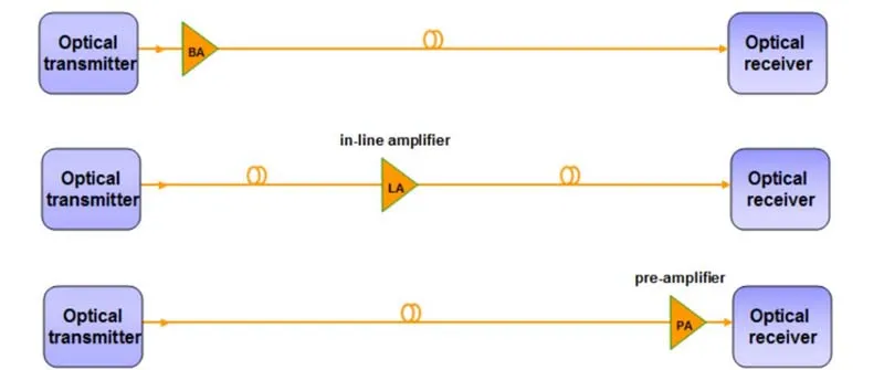 In a typical WDM System, optical amplifiers play a vital role in long-distance transmission. They strengthen weak optical signals and help maintain signal integrity. Therefore, a complete link usually includes three amplifier types: