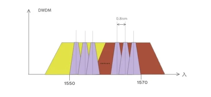 DWDM: wavelength interval <10nm, usually using 1550~1570nm band with wavelength interval of 200GHz (1.6nm), 100GHz (0.8nm) or 50GHz (0.4nm), (HTF: 1528nm~1565nm)