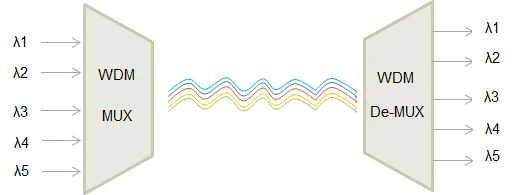 It has multiplexer and de-multiplexer. The multiplexer (MUX) combines multiple signal wavelengths in a single fiber for transmission at the transmitter side; the de-multiplexer (DEMUX) separates multiple wavelength signals transmitted in a single fiber at the receiver side. The main purpose of WDM is to increase the available bandwidth of the fiber, which can be expanded by WDM without the need to lay more fibers.